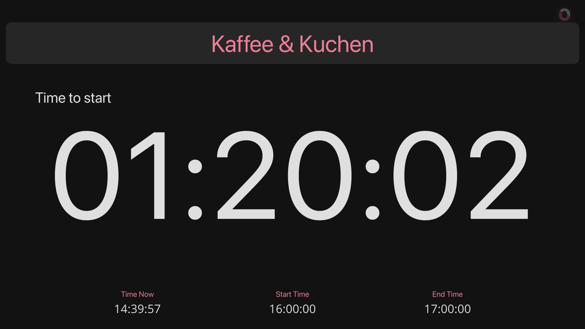 Die Countdown Ansicht zeigt nur die Zeit bis zu einem einzelnen Programmpunkt aus der Eventliste. Das bietet sich u. a. für Backstagebereiche an, denn hier kann man jeder Umkleidekabine nur die Zeit senden, die für die darin anwesenden Akteure auch eine Rolle spielt. Ruft man https://MEINE.IP.ADRESSE:4001/countdown auf, kann man einen Programmpunkt aus der Eventliste wählen und dann zählt Ontime auf diesen Event herunter.