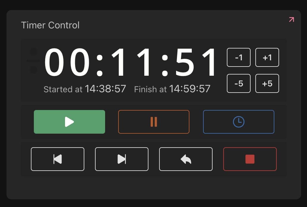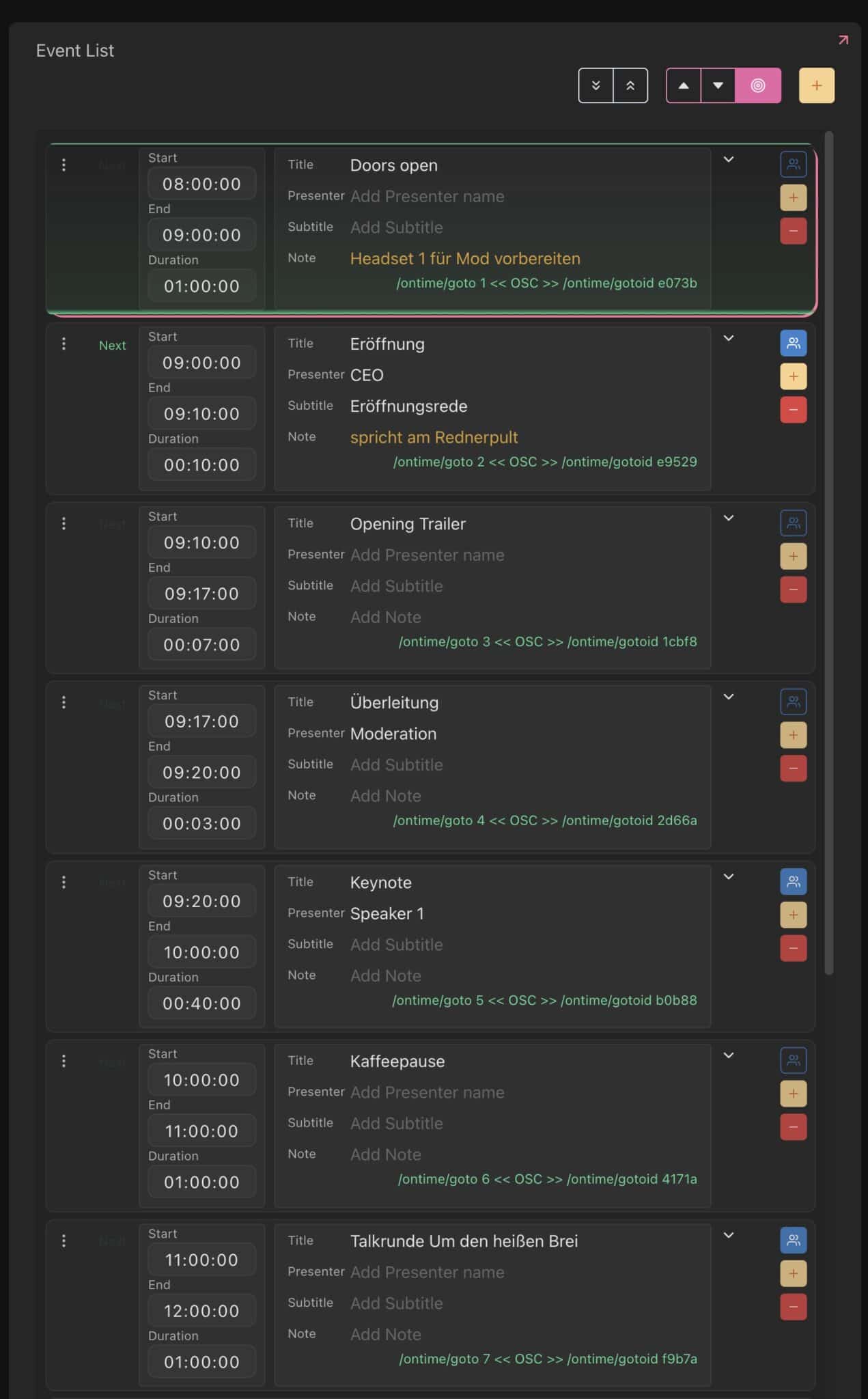 Der integrierte Countdown Timer ist ein besonders starkes Feature von Ontime. Die Zeiten des Timers orientieren sich an den Ereignissen in der Event-Liste. In der normalen Bedienoberfläche lassen sich Minuten in 5er -und 1er-Schritten hinzufügen und entfernen, sobald der Timer läuft. Genauer lässt sich per OSC auf diese Funktion zugreifen. Auf der Roadmap sind Funktionen vorgesehen, mit denen die Uhr schneller oder langsamer laufen kann, um zurück in den Plan zu kommen. Im „Roll mode“ springt die Software abhängig von der Systemzeit in den gerade laufenden Programmpunkt in der Eventliste und der Timer läuft automatisch durch das Tagesprogramm. Für den manuellen Betrieb ist die Anzeige, wann der aktuell laufende Timer gestartet wurde und enden wird, besonders praktisch. Unter dem Timer finden sich aktuell die wichtigsten Navigationsbuttons zum Steuern des Eventablaufs. Mit den Pfeilen navigiert man sich vor oder zurück in der Eventliste und kann Programmpunkte neu laden und starten. Es ist damit praktisch fast unmöglich, zu vergessen, den Timer zu starten. Auch hier gibt es per OSC weitere Steuermöglichkeiten.
