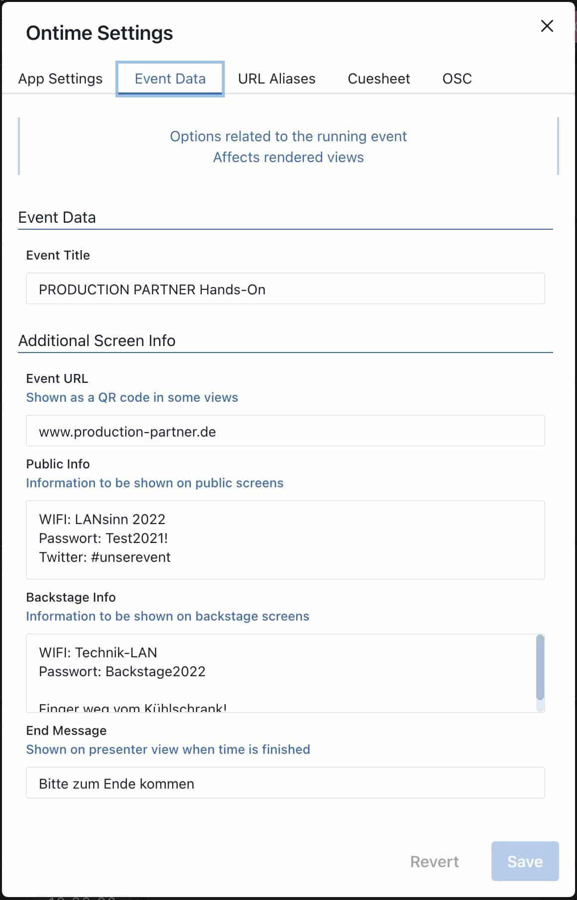 Unter Event Data werden Informationen zusammengefasst, die dann in den Ansichten von Ontime verfügbar sind