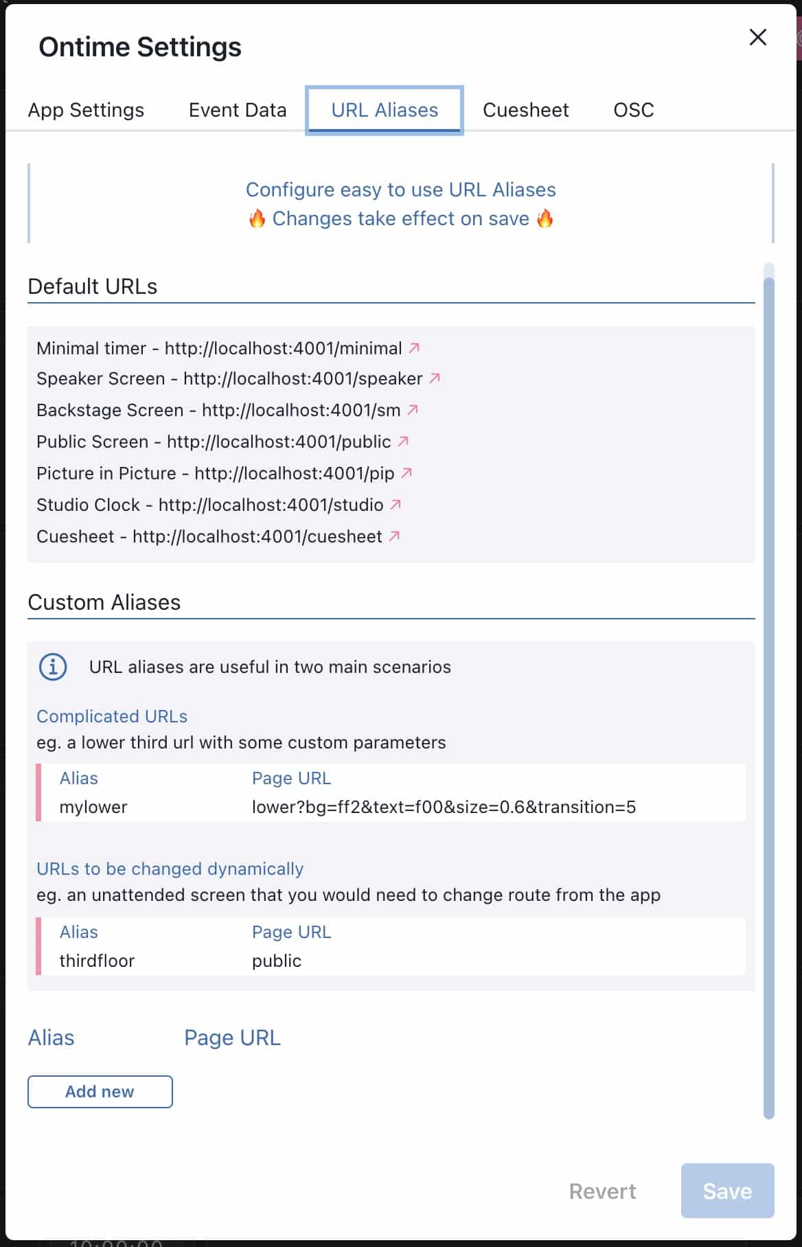 Das möchte man natürlich nicht jedes Mal neu eingeben müssen. Da für kann man in Ontime Aliase für Webseiten erstellen und aus der komplizierten Adresse beispielsweise ein simples https://MEINE.IP. ADRESSE:4001/keytimer machen.