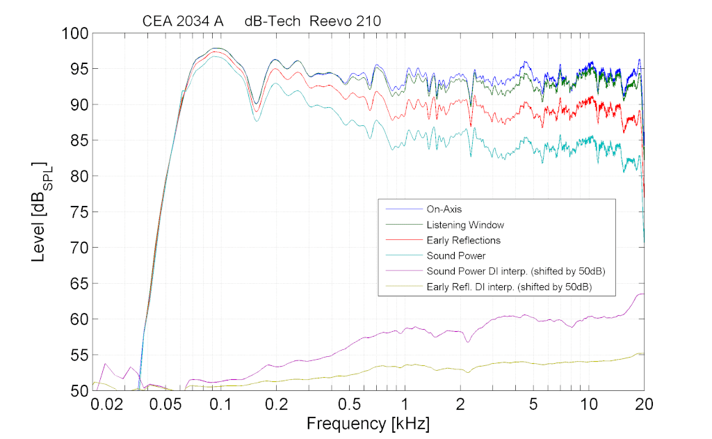 Die Reevo 210 stellt sich im Spinorama mustergültig dar. In Listening Window (grüne Kurve) entspricht der Frequenzgang nahezu genau dem Verlauf On-Axis (blaue Kurve). Frühe Reflexionen (rote Kurve) und die diffusen Raumschallanteile (türkise Kurve) werden entsprechend leiser aber mit gleichem Verlauf im Vergleich zur On-Axis Kurve angeregt.