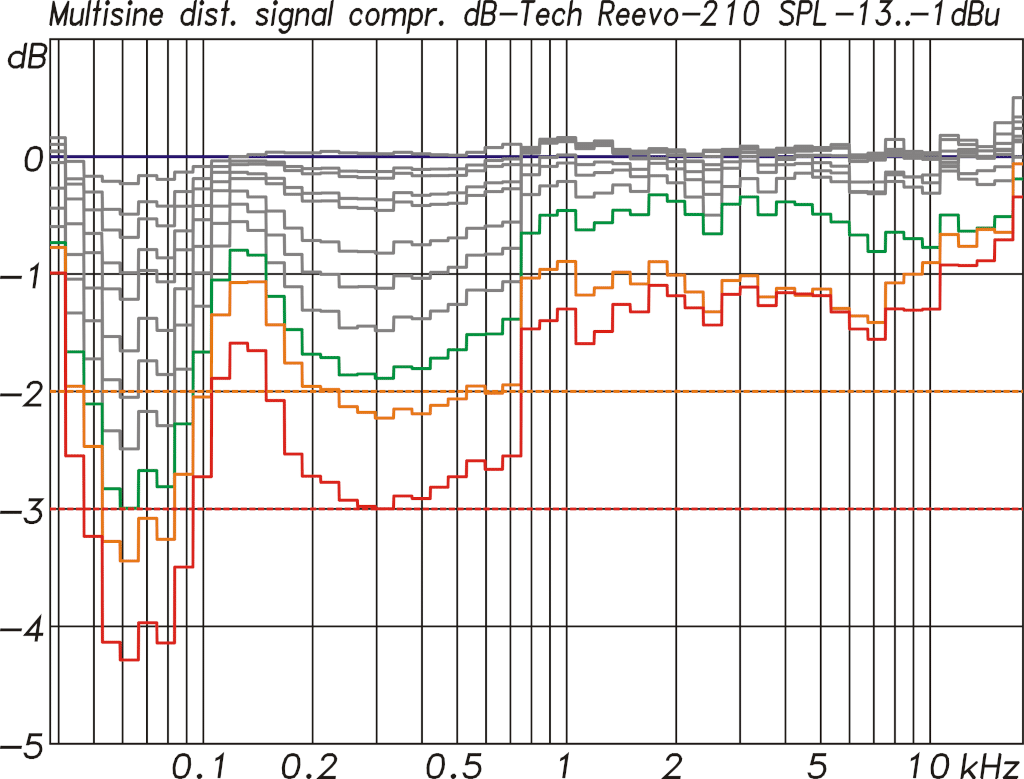 Die Begriffe Signalkompression oder Powercompression mögen an dieser Stelle etwas verwirrend wirken, da sie sonst im Zusammenhang mit thermischen Effekten bei Lautsprecher verwendet werden. Diese werden bei der Multitonmessung selbstverständlich auch erfasst, aber zusätzlich auch noch diverse andere Effekte wie Limiter, Begrenzung durch die Endstufen oder Netzteile und vieles mehr. Alternativ könnte man daher auch von „Abweichungen vom linearen Verhalten“ oder „Nichtlinearitäten“ sprechen.