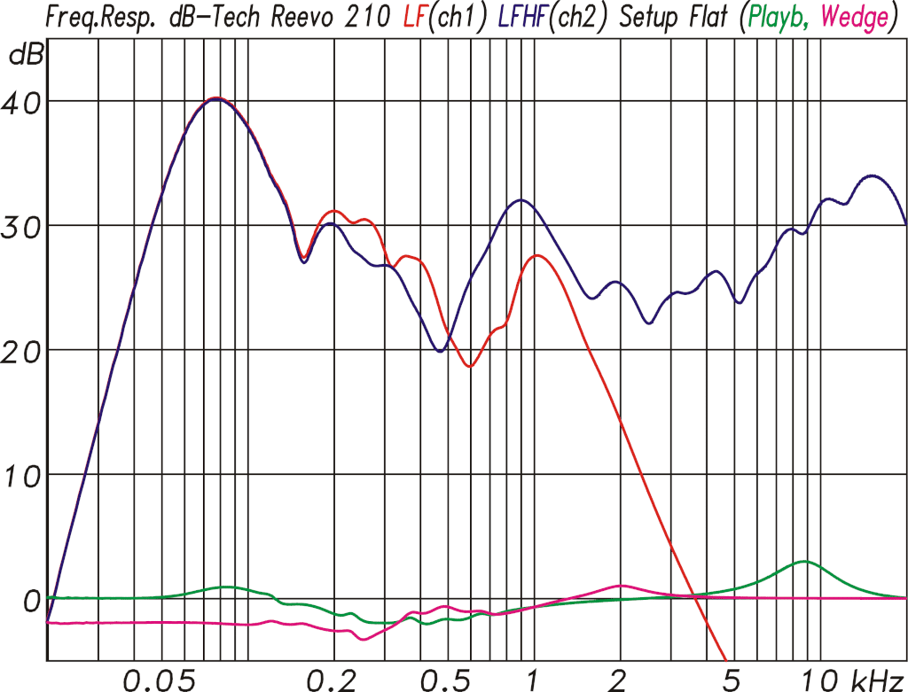 Abb. 4 zeigt die resultierenden Frequenzgänge der Reevo 210 in freier Aufstellung mit den Setups „Flat“ und „Playback“. In der Flat-Einstellung stellt sich ab 150Hz aufwärts ein nahezu perfekt gerader Frequenzgang ein. Das Setup hält somit, was sein Name verspricht. Die einzige Ausnahme ist die +5dB Anhebung bei 90Hz: Den oberen Bassbereich etwas anzuheben, ist ein gern gemachter psychoakustischer Trick, um eine Schwäche im Tiefbass zu kompensieren. Das ist hier jedoch nicht als Kritik an der Reevo 210 zu verstehen, sondern als Erklärung für den Verlauf des Frequenzganges bei tiefen Frequenzen: Eine kompakte 10″-Box mit einem auf Sensitivity getrimmten Tieftöner kann prinzipbedingt keine echte Tiefbasswiedergabe leisten. Die Box würde bei linearer Einstellung unweigerlich etwas zu dünn klingen, was sich in Grenzen durch eine Anhebung des etwas höher gelegenen Bassbereiches kompensieren lässt.