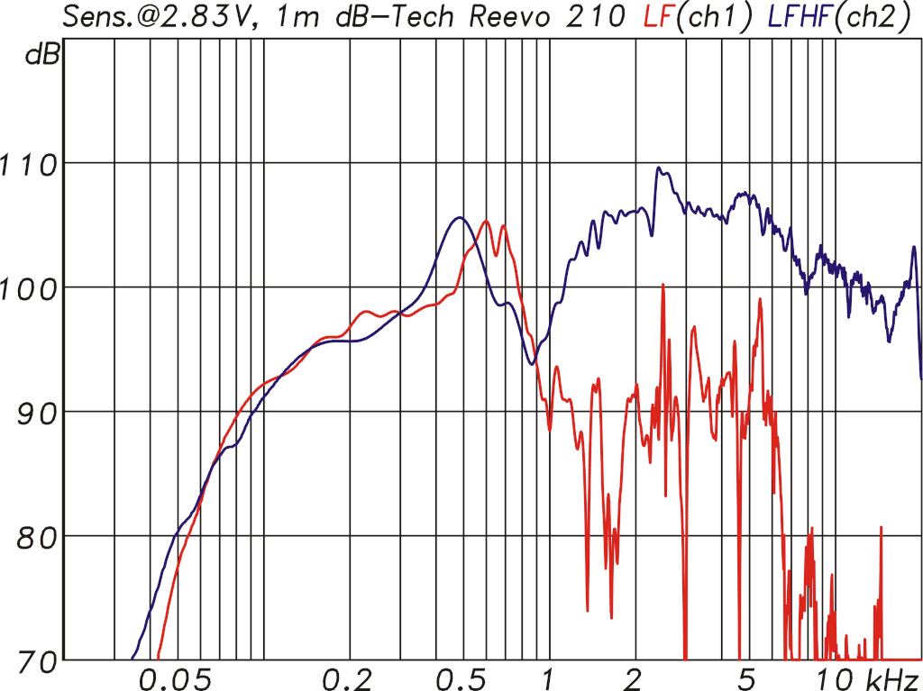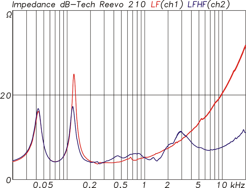 Um messtechnisch ein etwas umfassenderes Bild der Reevo 210 zu erhalten, wurde von uns zunächst die interne Elektronik abgeklemmt, so dass beide Wege direkt mit dem Messsystem verbunden werden konnten. Abb. 1 zeigt dazu zunächst die Impedanzverläufe mit der blauen Kurve für den passiv getrennten koaxialen Treiber und mit der roten Kurve für den zweiten Tieftöner. Eine weitere Auftrennung der beiden Wege des Coax-Treibers für die Messung erfolgte nicht. Die Bassreflexabstimmung liegt auf 70Hz, so dass die Box für viele Anwendungen auch ohne Unterstützung durch einen Subwoofer auskommt. Die Minima der Impedanzkurven liegen in beiden Fällen bei 3,7Ω, womit die Endstufen optimal ausgenutzt werden können.