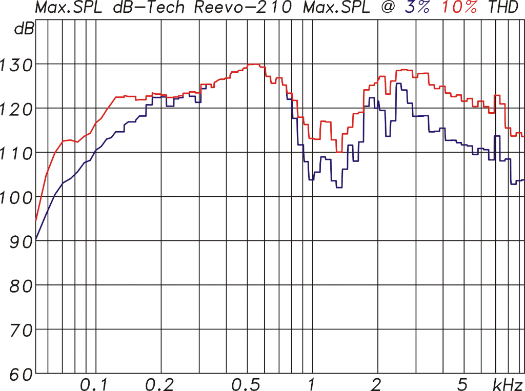 Abb. 11 zeigt die mit dieser Messmethode erreichten SPL-Werte der Reevo 210. Die beiden 10″-Tieftöner erreichen schon bei 70Hz gute 112dB bei maximal 10% Verzerrungen. Die rote 10% Kurve steigt dann bis auf 122dB an, um dann zusammen mit der blauen 3%-Kurve weiter bis zur 130dB Linie zu steigen. Dort, wo beide Kurven zusammenfallen, wird der 10%-Wert nicht erreicht, da hier vorher schon ein Limiter eingreift. Zwischen 700Hz und 2kHz sinken die Kurven um ca. 10dB ab. Die Ursache liegt hier im schon bekannten Einbruch im Frequenzgang der Tieftöner, was sich zwar für den Frequenzgangschrieb durch die entsprechende Filterung ausgleichen lässt, bei der Maximalpegelmessung aber nicht zu verbergen ist. Ab 2kHz aufwärts bestimmt dann der Hochtöner allein das Geschehen und die 10%-Kurve kommt der 130-dB-Linie wieder nahe. Im Weiteren laufen die 10%- und die 3%-Kurve dann bis zu Messgrenze bei 10kHz mit 10dB Versatz, wie es typisch für k2-dominierte Verzerrungen bei Kompressionstreibern ist.
