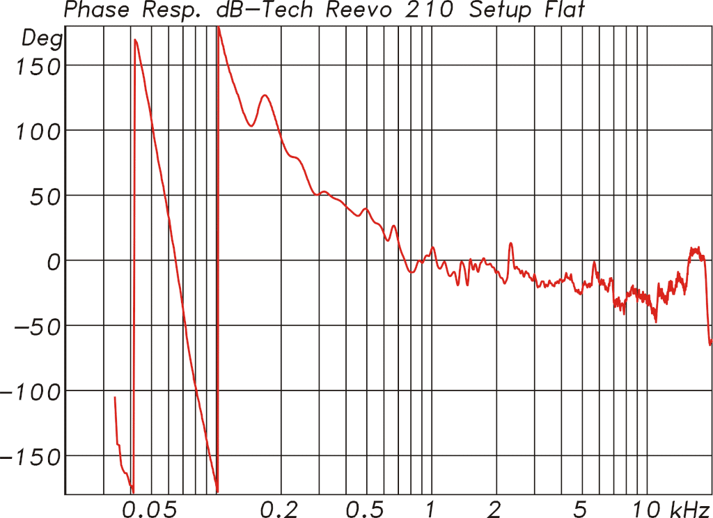 Den Phasengang der Reevo 210 der ab ca. 500Hz aufwärts einen weitgehend linearphasigen Verlauf aufweist, zeigt dazu Abb. 5. Dabei sind weder Phasendrehungen durch das passive Filter des Coax-Treibers noch durch die Ankopplung des zweiten Tieftöners zu erkennen. Zu den tiefen Frequenzen hin gibt es dann jedoch die obligatorischen 2 × 360° Phasendrehung durch das akustische und elektrische Hochpassfilter jeweils 4. Ordnung. Hier wäre mit Hilfe von FIR-Filtern auch ein linearphasiger Verlauf möglich, was jedoch zum einen eine recht hohe Rechenleistung erfordern und eine längere Latenz mit sich bringen würde. In dieser Konfiguration kommt die Reevo 210 mit einer Gesamtlatenz inklusive AD- und DA-Umsetzer von nur 3,6ms aus, die auch für den Einsatz als Monitor noch unkritisch sind.