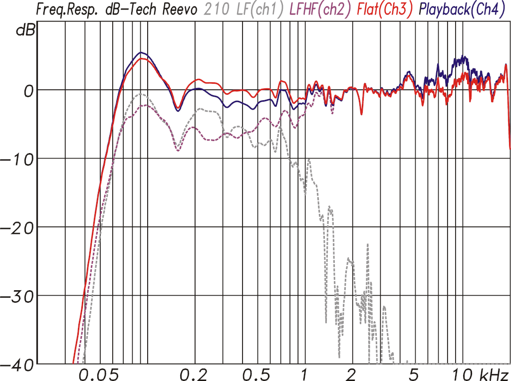 Frequenzgang der Reevo 210 in der Einstellung “Flat” (rot) und in der Einstellung “Playback” (blau), Die beiden gestrichelten Kurven zeigen die Anteile der beiden Wege am Gesamtverlauf (Abb. 4) (Bild: Anselm Goertz)