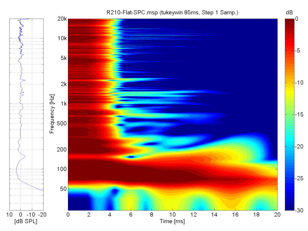 Phasengang der Reevo 210 in Einstellung „Flat“. Bei tiefen Frequenzen die obligatorischen 2 × 360 Phasendrehung durch das akustische und elektrische Hochpassfilter. Darüber hinaus dank FIR-Filterung ein linearphasiger Verlauf; die Latenz inklusive FIR-Filter liegt bei geringen 3,6ms (Abb. 5) (Bild: Anselm Goertz)Spektrogramm der Reevo 210 mit einigen kleinen Resonanzen im Frequenzbereich bis 2kHz (Abb. 6) (Bild: Anselm Goertz)