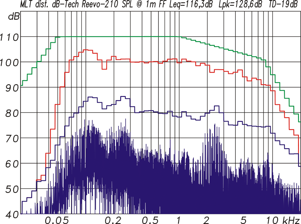 Für die Kurven aus Abb. 12 wurde die Messreihe im linearen Arbeitsbereich des Lautsprechers bei einem Eingangspegel der Endstufe von -13dBu und einem auf 1m bezogenen Schalldruck von 107,8dB gestartet und dann in 1-dB-Schritten gesteigert. Der Grenzwert von mehr als 2dB Abweichung wurde dann bei -2dBu Eingangspegel überschritten (orange Kurve in Abb. 12). Zur Auswertung kam somit die Messung mit -3dBu Eingangspegel (grüne Kurve in Abb. 12). Der dabei gemessene Pegel bezogen auf 1m betrug 116,3dB. Rein rechnerisch betrachtet hätte man 117,8dB erwartet. Der Spitzenpegel bei dieser Messung für eine Reevo 210 betrug 128,6dB. Die Gesamtverzerrungen lagen bei -19dB (11%) und damit auch schon knapp über dem Grenzwert von ‑20dB. Abb. 13 zeigt die Spektren dieser Messung mit dem Anregungssignal (grün), dem gemessen Schalldruck und den daraus extrahierten Verzerrungsanteilen(blau) mit einzelnen Frequenzlinien und in 1/6 Oktav Bandbreite aufsummiert. Der im Datenblatt angegeben Peak-Maximalpegel liegt ca. 4dB höher als unser Messwert, ohne jedoch eine Angabe über die Messmethode und das verwendete Messsignal zu machen. Bei einer Messung mit einem Pinknoise-Signal wären so z.B. durch den höheren Signalanteil für den Hochtöner auch merklich höhere Schalldruckwerte zu erwarten.