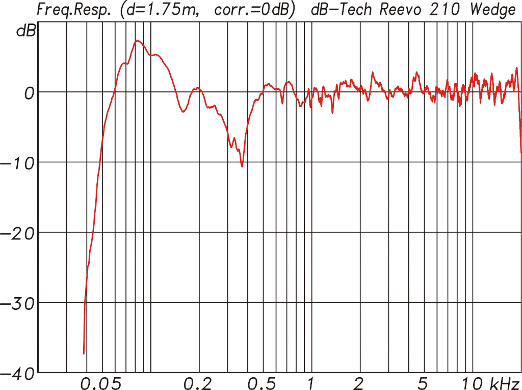 Neben den üblichen Messungen im Freifeld wurde die Reevo 210 auch noch in der Position als Bodenmonitor gemessen. Quer liegend auf der abgeschrägten Seite trifft die Mittelachse in ca. 1,75m Entfernung auf das in Ohrhöhe platzierte Messmikrofon, das auf die Mittelachse der Box ausgerichtet ist. Für den Einsatz als Bodenmonitor gibt es ein eigenes mit Wedge-Setup. Der sich damit einstellende Frequenzgang ist in Abb. 7 abgebildet. Der Verlauf ähnelt dem im Flat-Modus mit einem insgesamt sehr geradlinigen Verlauf und einer recht kräftigen Überhöhung zwischen 60 und 150Hz. Der scharfe Einbruch zwischen 300 und 400Hz entsteht in dieser Position unvermeidlich durch die Bodenreflexion. Eine Korrektur durch ein elektrisches Filter wäre möglich, aber nur wenig sinnvoll, da sich der Einbruch abhängig vom Abstand und Winkel der Messposition verschiebt. Wieweit die kräftige Anhebung darunter für den Einsatz als Monitor erwünscht ist, sei einmal dahingestellt. Falls nicht gewünscht, lässt sich diese natürlich leicht durch einen entsprechenden EQ im Zuspielweg auch wieder kompensieren.