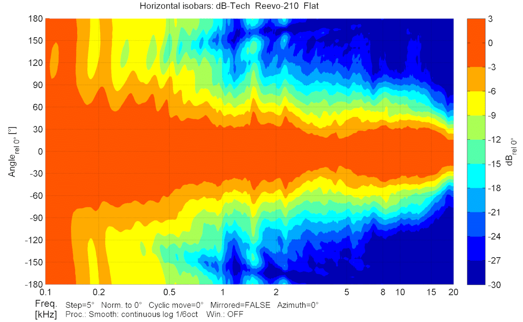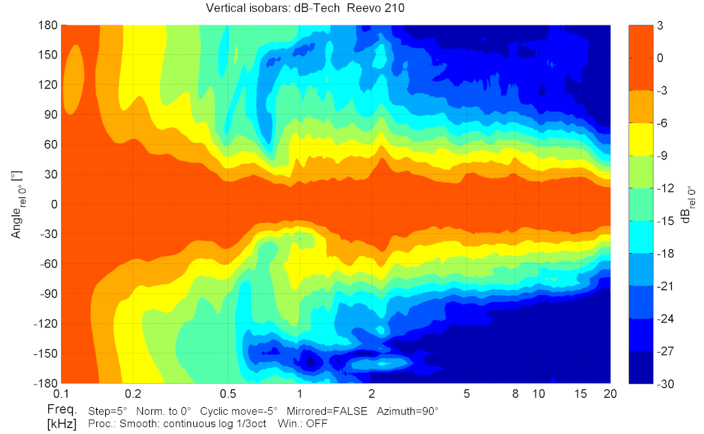 Im Datenblatt wird die Reevo 210 mit einem Abstrahlwinkel von 100 × 90° angegeben, was für eine Universalbox als üblicher Standard zu sehen ist. Die dazu ausgeführten Messungen auf dem Drehteller lieferten die Isobarenkurven aus Abb. 8 (horizontal) und Abb. 9 (vertikal). In der Horizontalen sind die ‑6dB Isobaren unterhalb von 2kHz etwas breiter als die nominellen 100° und oberhalb etwas schmaler, woraus sich je nach Betrachtungsweise die 100° ergeben.
