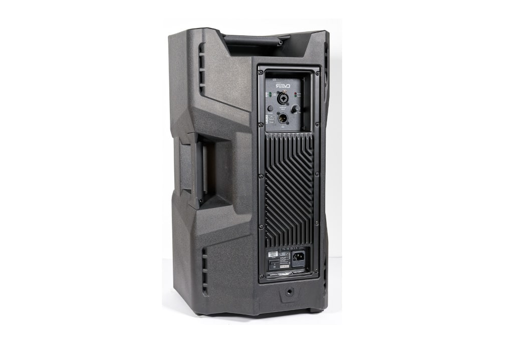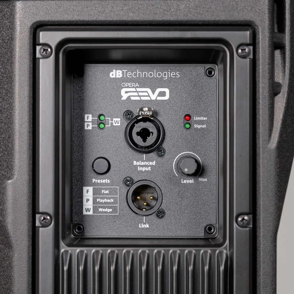 Auf der Rückseite befindet sich das hauseigene Elektronikmodul DigiPro G2 mit zwei Class-D-Endstufen und DSP. Das rein passiv gekühlte Modul liefert laut Datenblatt eine RMS-Leistung von 1050W und eine Peak-Leistung von 2100W. Die Zuspielung des Eingangssignals erfolgt analog über eine XLR/Klinken-Kombibuchse mit Link-Ausgang. Die Setups (Flat, Playback und Wedge) werden in einfacher Wiese über einen Taster mit LED-Anzeige ausgewählt. Netzwerkanschlüsse etc. gibt es nicht, da die Reevo-Modelle mit Bedacht einfach und übersichtlich gehalten wurden.