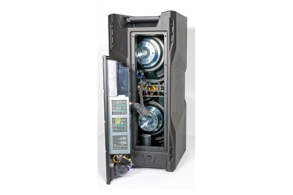 Aufwändige Konstruktion hinter dem Schutzgitter mit einer koaxialen Anordnung eines 10″-Treibers mit Hochtöner oben und des zweiten 10″-Treibers mit Phaseplug unten (Bild: dBTechnologies)