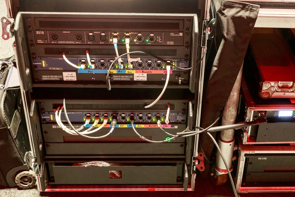 Demorack mit DS100 sowie zwei Luminex-Switches und einem DS10 (Schnittstelle zwischen dem Dante-Netzwerk und digitalen AES3-Audiosignalen) sowie hinter der Blende zwei Apple-Mini-PCs (Bild: Herbert Bernstädt)