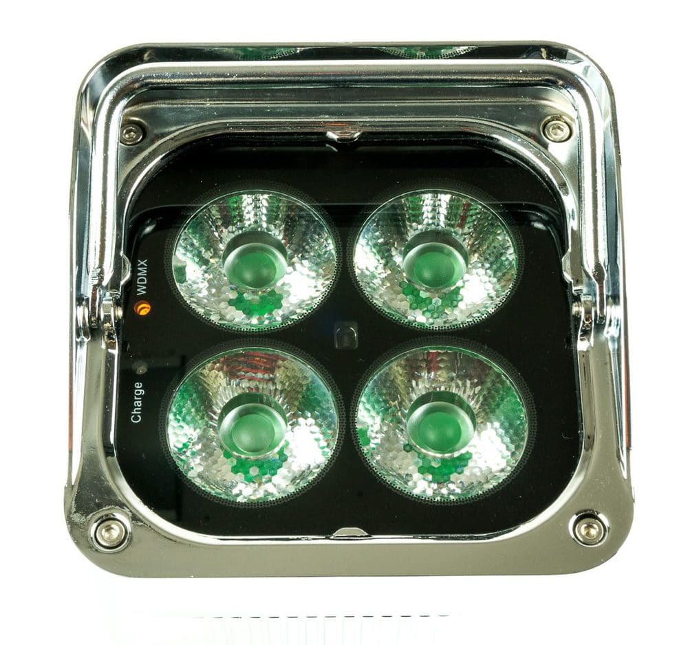 Die unspektakuläre, kubische Form ist äußerst pragmatisch designed und bietet auf der Oberseite neben den LED-Emittern einen klappbaren Griff zum einfachen Handling des lediglich 3,6 kg schweren Gerätes. Unterseitig fallen neben dem On/Off-Taster und dem OLED-Display mit Anzeige von DMX-Modus und Adresse, Signalstärke und Akkustand vor allem ein mechanischer Stellfuß sowie der „Wasserkocher“- Ladeanschluss für den 16,8-V-Lithium-Akku ins Auge. Der etwas klappernde, aber stabile Stellfuß lässt sich sehr leicht über eine seitlich angebrachte Arretierung verstellen und ermöglicht eine Neigung des Uplights von bis zu 20° in Richtung Wand. Alternativ können auch Coupler oder Haken für einen hängenden Betrieb an ein seitlich angebrachtes M12- Gewinde montiert werden – allerdings fehlt in diesem Fall eine gekennzeichnete Befestigungsmöglichkeit für die Sekundärsicherung. Der Ladeanschluss bietet eine extrem komfortable Lademöglichkeit direkt im eigens dafür konstruierten Case – darüber hinaus allerdings auch keine Möglichkeit, den SmartBatPlus auf längeren Events alternativ über Feststrom zu betreiben.