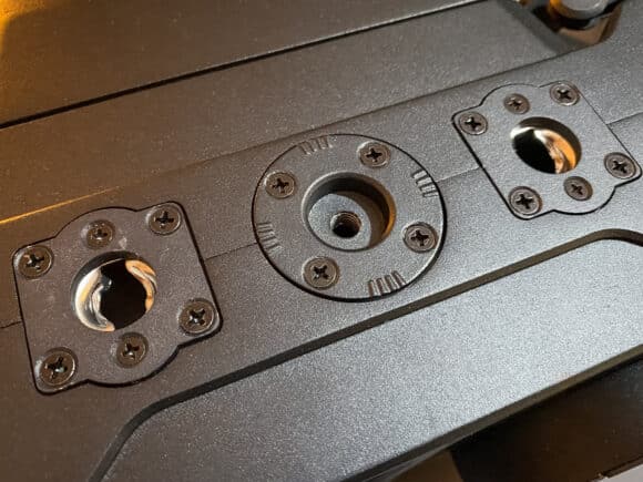 Für anderweitige Montage-Ideen sind sowohl das Gehäuse inklusive der mitgelieferten Bügel als auch die optional erhältlichen Zubehörteile mit einer Vielzahl von Befestigungsmöglichkeiten versehen worden. Hierzu zählen am Gerät selbst jeweils zwei Camlock-Kupplungen an der Ober- und der Rückseite der Scheinwerfer, sowie ein mittig platziertes M10-Gewinde an der Ober- und Unterseite der Geräte. Alle verfügbaren Bügel bieten mit Camlock-Verschlüssen, zwei M8-Gewinden für die Floor Extension und drei Bohrungen für M12-Schrauben ebenfalls mannigfaltige Befestigungsmöglichkeiten. Für die nahtlose vertikale Montage an Traversen steht ein spezielles „Rigging Bracket“ und eine TV- Spigot Aufnahme zur Verfügung. Die beiden Omega-Bügel des Brackets können über die gesamte Breite beliebig verschoben werden.