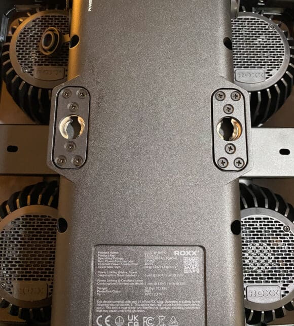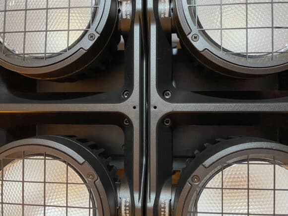 Im Hinblick auf artverwandte Produkte vorangegangener Generationen haben sowohl das Design als auch die Architektur der neuen Blinder aus dem Hause ROXX eine wahre Renaissance erlebt. Zum einen sind die Scheinwerfergehäuse speziell dahingehend konzipiert worden, nahtlos aneinander montiert zu werden. Zum anderen verleiht die spezielle Einfassung der einzelnen Leuchtmittel und das schmale Chassis auf der Rückseite, welches die Elektronik, die Anschlüsse und das Display beherbergt, den neuen Geräten eine gewisse Transparenz und optische Leichtigkeit. Darüber hinaus verhilft die geschlossene Bauart des Aluminium-Gehäuses den Scheinwerfern zu einer IP-65-Klassifizierung, was sich jedoch auch merklich in Punkto Masse widerspiegelt.