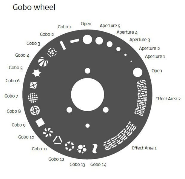 Beambearbeitung: Das Goborad bietet neben einer guten Auswahl an Motiven auch Pseudo-Iris-Blenden, die den Abstrahlwinkel mechanisch auf bis zu 0,3 abschatten können. Die beiden Effekt-Areas imitieren mittels Oszillation bei langsamen Geschwindigkeiten ein Animationsrad. (Bild: SGM)