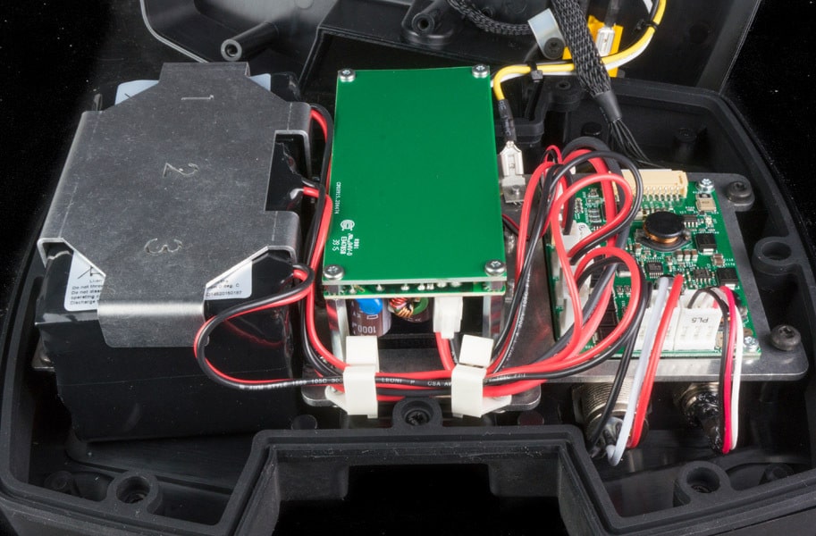 Große Akkus Einen großen Teil des Platzes im Basement nehmen die drei Lithium-Ionen-Akkumulatoren (links) ein. Die komplette Elektronik samt Motoren und Display sind im Bügel des G-1 untergebracht (Bild: Stefan Junker)