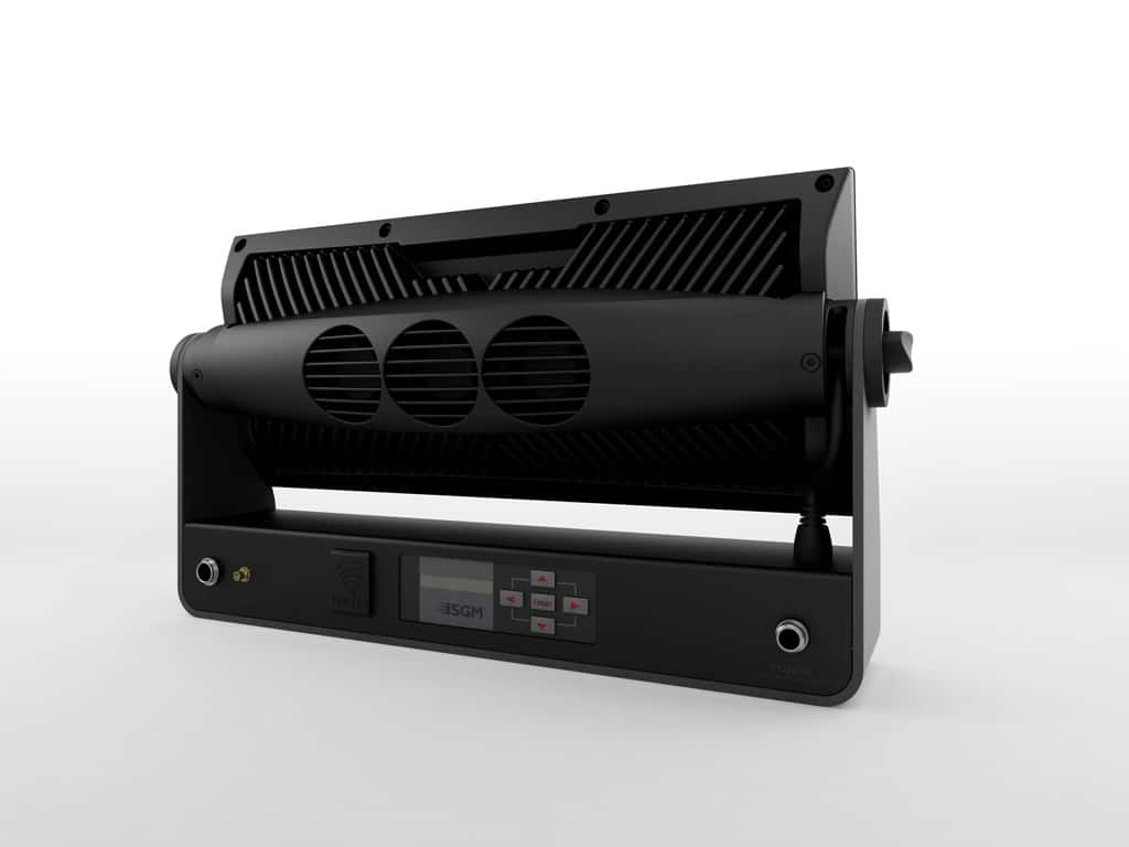 Der Q7-W ist nicht nur sehr formschön, sondern dabei auch noch Outdoor-geeignet. Seine extrem hohe Lichtleistung, gepaart mit einer hohen Leuchtdichte und einem Abstrahlwinkel von ca. 120° lassen ihn universell als Fluter, Blinder oder Stroboskop einsetzen. Durch die vier getrennt steuerbaren Weißlicht-LED-Flächen lassen sich auch Matrixeffekte realisieren. Neuartig ist die Bedienung des Q7-W über ein Handy mit entsprechender App, wobei die übliche Steuerung über DMX und W-DMX alle Notwendigkeiten abdeckt. SGM zeigt mit ihrem Q7-W, dass funktionale Technik auch schön und Leistungsstark sein kann.