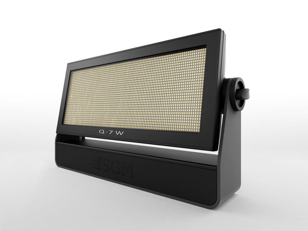 Gleich um es vorweg zu nehmen, der Q7 gehört nach der SGM-Namensgebung zur Familie der Fluter bzw. Washlights. Aber aufgrund seiner enormen Leuchtdichte, welche insbesondere durch die hohe Packungsdichte der LEDs erreicht wird, ist der Q7 ebenso als Blinder geeignet. Sein großer Abstrahlwinkel von 120° hilft hierbei möglichst breit in das Publikum zu „blenden“. Ebenso gut ist der Q7-W als ein sehr lichtstarker LED-Scheinwerfer zur Grundausleuchtung von Bühnen, Flächen oder z. B. auch Messeständen geeignet. Durch die schnelle Reaktionszeit der LEDs ist der Q7-W mit diesen optischen Eigenschaften auch sehr gut als Stroboskop einzusetzen. Mit seiner blockweisen Ansteuerung der Einzelelemente ist sogar eine Anwendung als Gegenlicht-Matrix auf Bühnen möglich. Damit avanciert der Q7-W zu einem absoluten Weißlicht-Multitalent, der die Eigenschaften von Matrix, Fluter, Blinder und Stroboskop in sich vereint. Die Anwendungsvielfalt wird sowohl in der festen Installation als auch im Produktions- und Vermietungsgeschäft sehr gut ankommen.