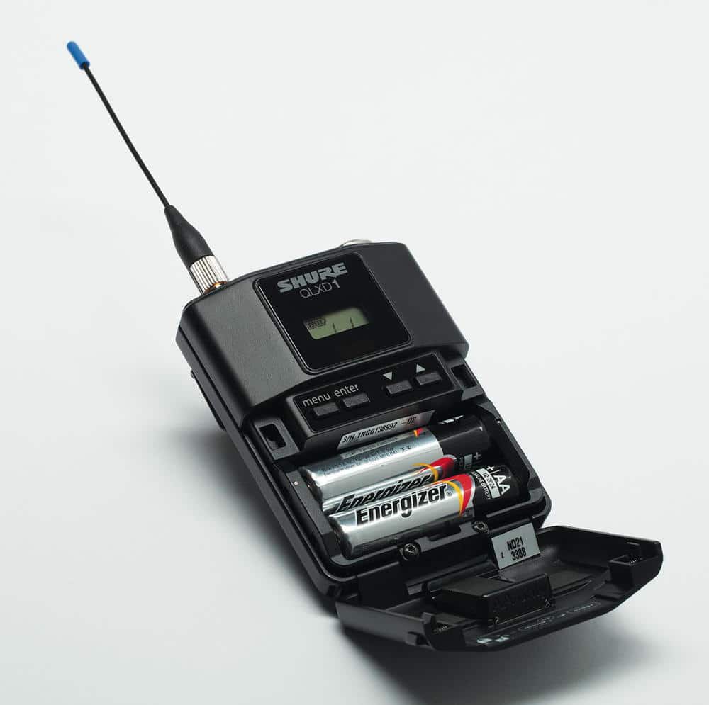 Der Taschensender wird mit zwei AA- Batterien oder mit dem SB900, einem Lithium-Ionen-Akku mit einer Kapazität von 1.450 mAh, betrieben. Auch hier zeigt sich die Kompatibilität zum Taschensender ULXD1, der mit dem gleichen Akkutyp betrieben werden kann. Somit lassen sie sich auf den gleichen Ladegeräten einsetzen, das vereinfacht den Mischbetrieb von ULX-D und QLX-D. Auch die Sendeantenne (1/4-Wellenlänge, geschraubt, SMA) und der Anschluss für das Mikrofon (vierpolig MiniXLR) oder ein Instrumentenadapterkabel (WA-305) sind gleich.