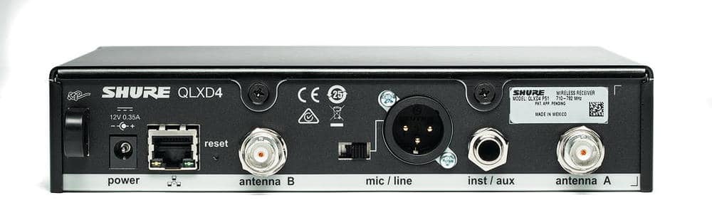 Der Diversity-Empfänger QLXD4 im 9,5-Zoll-Format verfügt auf der Geräterückseite, auf der sich alle Anschlüsse befinden, über zwei BNC-Buchsen zum Anschluss von zwei Antennen. Es liegen dem Empfänger zwei Antennen (halbe Wellenlänge) bei. Der QLXD4 verfügt über einen symmetrischen XLR-Ausgang. Der Ausgangspegel lässt sich über einen Schalter auf Line oder Mikrofonpegel umschalten. Weiter gibt es noch einen zusätzlichen symmetrischen Klinkenausgang. Der Empfänger lässt sich auch in ein Netzwerk einbinden und dann auch fernsteuern. Dazu ist eine Ethernet-Schnittstelle vorhanden. Über eine Reset-Taste lassen sich die Standardeinstellungen wieder herstellen.