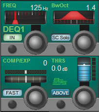 In jedem Eingang findet sich ein dynamischer Vierband-EQ mit umfangreichem Bedienfeld. Eingestellt werden können, wie bei einem normalen EQ, die Frequenz und die Bandbreite, aber kein Gain, das wird durch den Compressor gesteuert. Für den Compressor können die generelle Funktion Compressor oder Expander, der Schwellwert (Threshold) und die Zeitkonstante Fast/Slow gewählt werden. Zum Schwellwert lässt sich noch auswählen, ob dieser für die gewählte Funktion beim Über- oder Unterschreiten aktiv wird. Mit der Taste SC Solo besteht zudem die Möglichkeit, in den gefilterten Side Chain direkt hineinzuhören.