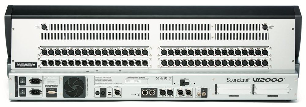 Den schnellsten Eindruck von den Verbindungen eines Pultes zur Außenwelt bekommt man mit einem Blick auf dessen Rückseite: Beim Vi2000 finden sich hier vier lange, quer liegend eingebaute Slots, die 16-kanalige Karten mit analogen Ein- oder Ausgängen aufnehmen können. Die Bestückung kann als 48/16, 32/32 oder 16/48 erfolgen. Vier weitere Slots im D21-Format können diverse Erweiterungskarten aufnehmen. Als Doppelkarten, die jeweils zwei D21-Slots belegen, gibt es Interfaces für MADI, Dante, RockNet, AES/EBU und EtherSound. Mit einem Slot kommen die Karten für BLU link, CobraNet, A-Net, Dolby-E, 3G SDI und ADAT aus.