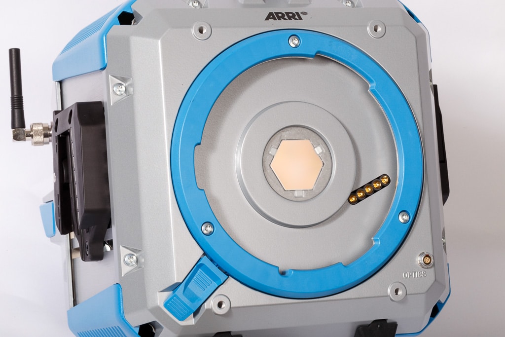 Bajonettsysteme und Datenübertragungen am Objektiv kennen wir von Kameras. Beinahe selbstredend, dass nach Anbringen der Optiken beim Orbiter keinerlei Spiel zu verzeichnen ist: sitzt einwandfrei und nichts wackelt. Aber der Anspruch eines ARRI Orbiter geht weit darüber hinaus. Die gelungene akkurate mechanische Anbindung an das Lampengehäuse ist eine Sache. Bei der Bajonettlösung (von ARRI Quick Lighting Mount /QLM genannt) werden auch elektrische Verbindungen zur Optik aufgebaut. So „weiß“ der Orbiter, mit welcher Optik er bestückt wurde. Zurzeit dimmt er das Licht auf 0, wenn keine Optik aufgesetzt ist, beim Aufsetzen geht er nach einer kurzen Wartezeit wieder an.