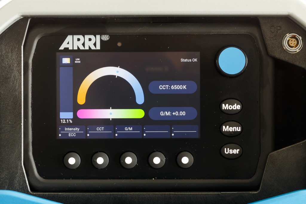 Herzstück des Orbiter ist eine RGBACL-LED-Engine, also eine Farbmischung aus Rot, Grün, Blau, Amber, Cyan und Lime-Farben, genannt ARRI Spectra. Wie wir wissen, ist mit einer Multifarb-LED-Engine nicht nur eine sehr hohe Farbwiedergabequalität möglich, sie erlaubt auch jede Farbtemperatur und Farbkorrektur wie Tint (Grün-Magenta-Verfärbung) und selbstredend natürlich auch allgemein Farben innerhalb des verfügbaren Farbraumes. Dazu werden die 206 Farbchips in einer ausgeklügelten Anordnung und Gewichtung zueinander auf eine Platine verbracht. Folglich ist die Lichtstrom-Differenz – von „5600K CCT Weißlicht mit 15.000 lm“ zu „alle Direkt-LEDs an mit 15.700 lm“ nicht groß. Dass das gemischte CCT-Weiß mit 3200K einen kleineren Lichtstrom aufweist, ist der Physik geschuldet. Er beträgt aber immerhin noch stolze ca. 12.000 lm.