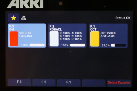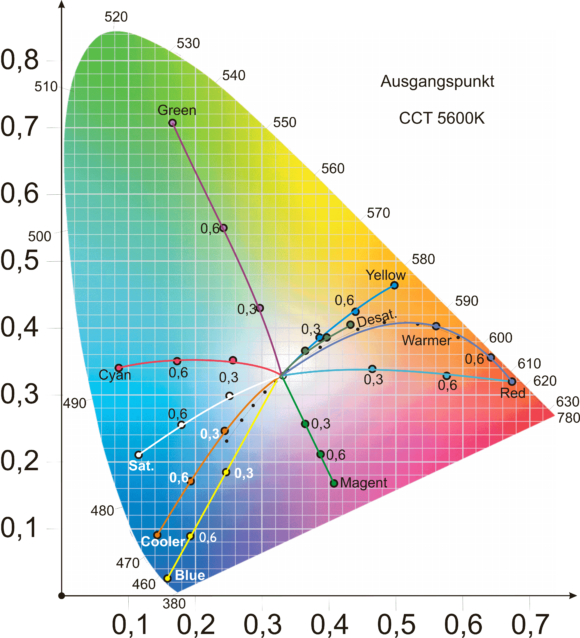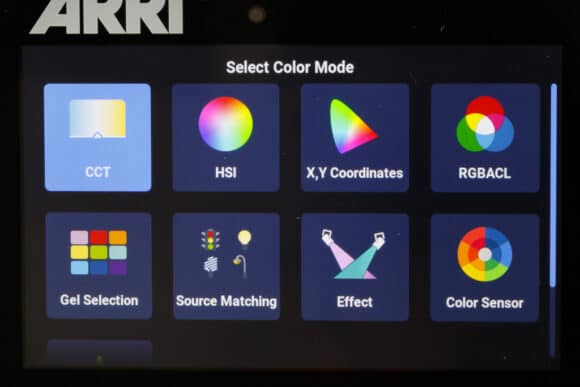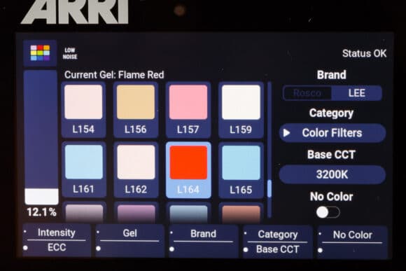 Alleine beeindruckend, dass man einzelnen Filterserien wie Color Correction, Color Filters, 600 Serie, Cosmetic Filters, 700 Serie von Lee oder Color Correction, CalColor, Storaro Selection und Cinelux von Rosco auswählen kann. Dazu kann man zur Farbfolie noch die Lichtquelle in der Farbtemperatur zwischen 2.000K bis 20.000K definieren. Neben den Standard-Funktionen HSI, CCT und LED-Direkt ist die Möglichkeit, die x- und y-Position im Farbdreieck anzugeben, sonst eher selten zu finden. Sie würde aber herstellerübergreifend auch über DMX-Ansteuerung das gleiche Ergebnis liefern, wenn man es nach dem gleichen Algorithmus berechnet, den ARRI in der Orbiter-DMX-Tabelle veröffentlicht.