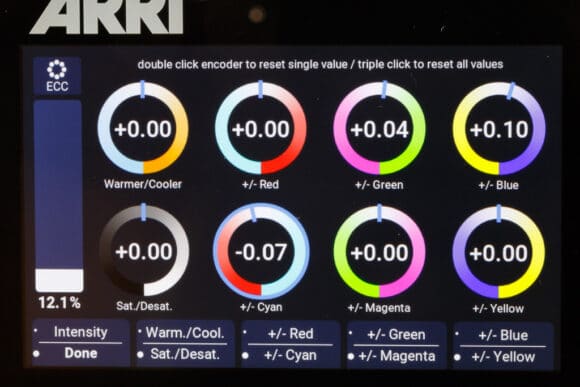 Kommt man in eine Location, die mit einer bestimmt Lichtquelle wie Quecksilberdampfbrenner beleuchtet wird, dann kann man auch über „Color Matching“ die entsprechende Lichtquelle haussuchen, worauf der Orbiter diese Lichtfarbe dann wiedergibt. Dabei findet man unter den Gruppen Glühlicht, Leuchtstoff-, Entladungs- und andere Lampen auch Exoten wie Pflanzenlicht, Wärmelampe, Schwarzlicht oder Chemische Leuchtstäbe. Sicher wird man bei Schwarzlicht eine andere Erwartung haben oder auch die Elektrische-Weihnachtsbaum-Kerze wird hier oder da in einer anderen Lichtfarbe als beim Orbiter erscheinen. Aber man kann sich mit Hilfe von ECC (Extended Color Control – erweiterte Farbsteuerung) die Farbe auch noch in die Richtung drehen, wie es der eigenen Vorstellung entspricht, ohne dafür die einzelnen LEDs zueinander abzumischen. Dafür muss der Lichtsetzende nur noch die Richtung vorgeben ob es rötlicher, grünlicher, blauer oder nur wärmer oder gesättigter werden soll. Abgerundet wird der Bedienkomfort durch kleine Einstellhilfen wie Doppelklick (der Wert wird zu Null gesetzt) oder Dreifachklick (alle Werte werden auf null gesetzt).
