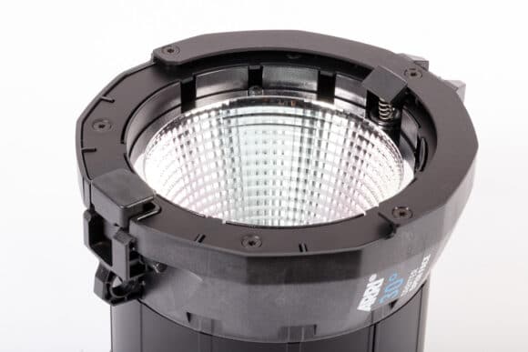 In unserem Test nutzten wir die achtflügeligen Torblenden, die gewohnt ARRI-like sind. Im Gegensatz zu den 4-Klammer-Befestigungen, wie wir sie von den ARRI-Stufenlinsen her kennen, ist hier die Zubehöraufnahme halbrund lichtdicht ausgeführt. Sie weist unten noch eine zweite Verriegelung für das Zubehör auf, um das Zubehör-Sicherungsseilchen überflüssig werden zu lassen. Der Aufnahmeschlitz ist recht eng gehalten, sodass kaum Streulicht in den Raum fällt, wobei auch die Reflektor-Optik dafür sorgt, dass kaum Streulicht anfällt. Da bereits der Lichtaustritt beim Orbiter eine durchmischte Farbe bereitstellt, sind auch in der Lichtprojektion keine Farbränder oder Farbschatten zu erkennen. Wie bereits erwähnt, läuft das Licht zum Rand hin weich ab.