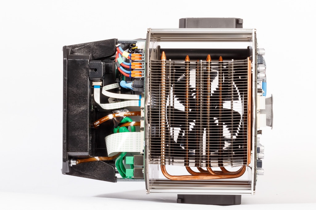 Die Wärme der LED-Chips wird via Heatpipe an großflächige, dünne Bleche abgegeben. Die wiederum können ihre Wärme mit der Luft austauschen, wobei ein sehr großer Lüfter mit langsamer Drehzahl beinahe geräuschlos für einen schnelleren Luftstrom sorgt. Selbstverständlich ist der Lüfter geregelt und der Anwender kann den Lüfter auch über DMX ausschalten … Na ja, auch wenn in der DMX-Tabelle Fan Off steht – bei unserem Testgerät hat er sich weitergedreht.