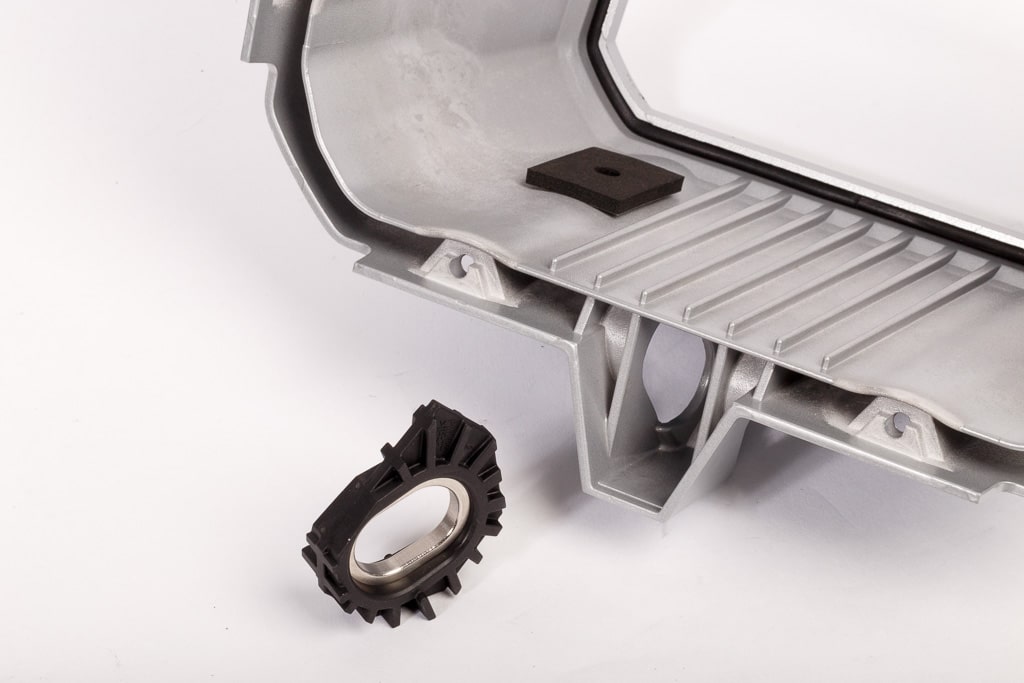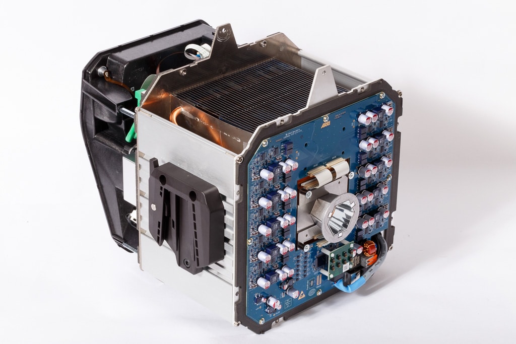 Der Orbiter besteht aus drei Abschnitten, wobei der mittlere mit dem Kühlsystem von Regen durchdrungen werden kann (Verdunstungskälte hilft ja bekanntlich bei der Kühlung …). Bis auf den Lüfter und dessen Anschluss ist in dem mittleren Bereich mit Trägerblechen und als Seitenverbindungen zwei Strangguss-Profilen nichts Elektrisches. Die Verbindungskabel zwischen hinterer Sektion und der Frontkammer verlaufen innerhalb einer abgedichteten Röhre. Um das LED-Board ist die Treiberplatine angeordnet. Sie befindet sich in einem geschützten Frontbereich, der ebenfalls aus Aludruckguss besteht und die Bajonettaufnahme trägt und mit einer Gummisicke zur vorderen Trägerwand hin abgedichtet wird.