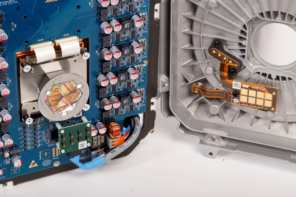 Sehr elegant und servicefreundlich ist der elektrische Übergang von der Treiberplatine zur Front-Druckgussabdeckung realisiert. Hier werden die Spannungen und Ströme an das Objektiv weitergeben. Auf Steckverbinder wird verzichtet und mit einem aufwändigen, federbehafteten Kontaktsystem wird eine Verbindung geschaffen. So kann man die Front abschrauben, ohne Gefahr zu laufen, irgendwelche Kabel zu ziehen (oder beim Zusammenschrauben Kabel zu quetschen).