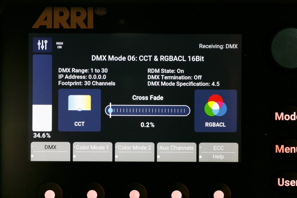 Das Control-Panel bietet auch eine optische Kontrolle in einer äußerst übersichtlichen Darstellung der übertragenen DMX-Werte. Schade, dass sich das Panel bei DMX-Betrieb ständig abdunkelt und sich nicht an das „always on“ im Display-Menü gebunden fühlt. Aber wie setzt man so einen Ultimate Mode in einem aktuellen großen Lichtstellpult um? Bei dem von der ARRI-Website heruntergeladenen GDTF File und mit der GMA3 wird der Farbauswahlmode über den Control/Mode eingestellt. Dabei erhalten die DMX-Kreise für die Farb-Mode-Einstellung, wie auch die Parameterkreise 1-9 jeweils die gleichen DMX-Werte, so dass der Überblendkanal eigentlich immer nur auf das gleiche Licht überblenden kann. So wird man sich dann doch für einen der Nicht-Ultimate-Modes entscheiden.