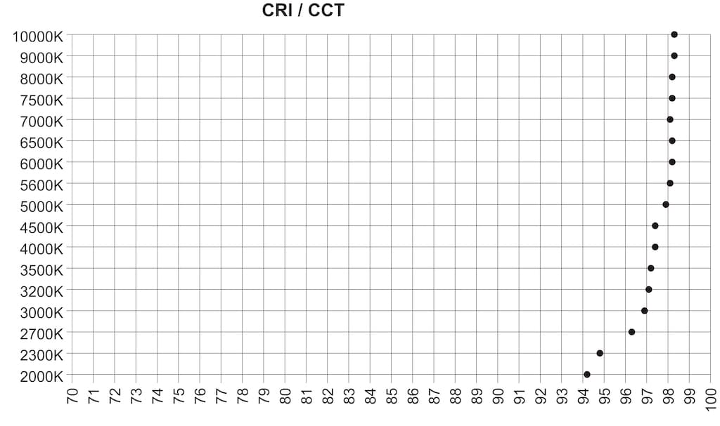 In unseren bisherigen Tests traf der maximale CRI-Wert vor allem bei einer Farbtemperatur zu – er fiel dann meist bei den anderen Farbtemperaturen erheblich ab. Der Orbiter zeigt hier eine bis dahin noch nicht gekannte Qualität: Von 10.000K bis 5.600K ist der CRI auf gleichem Höchstniveau und geht bis 3.000K nur marginal auf einen Wert zurück, den andere nur schwer erklimmen. Respekt!