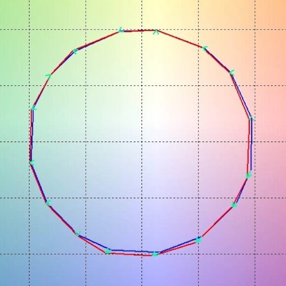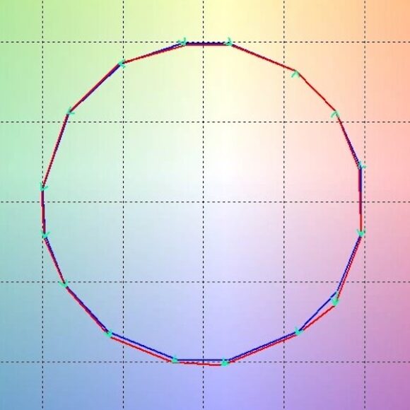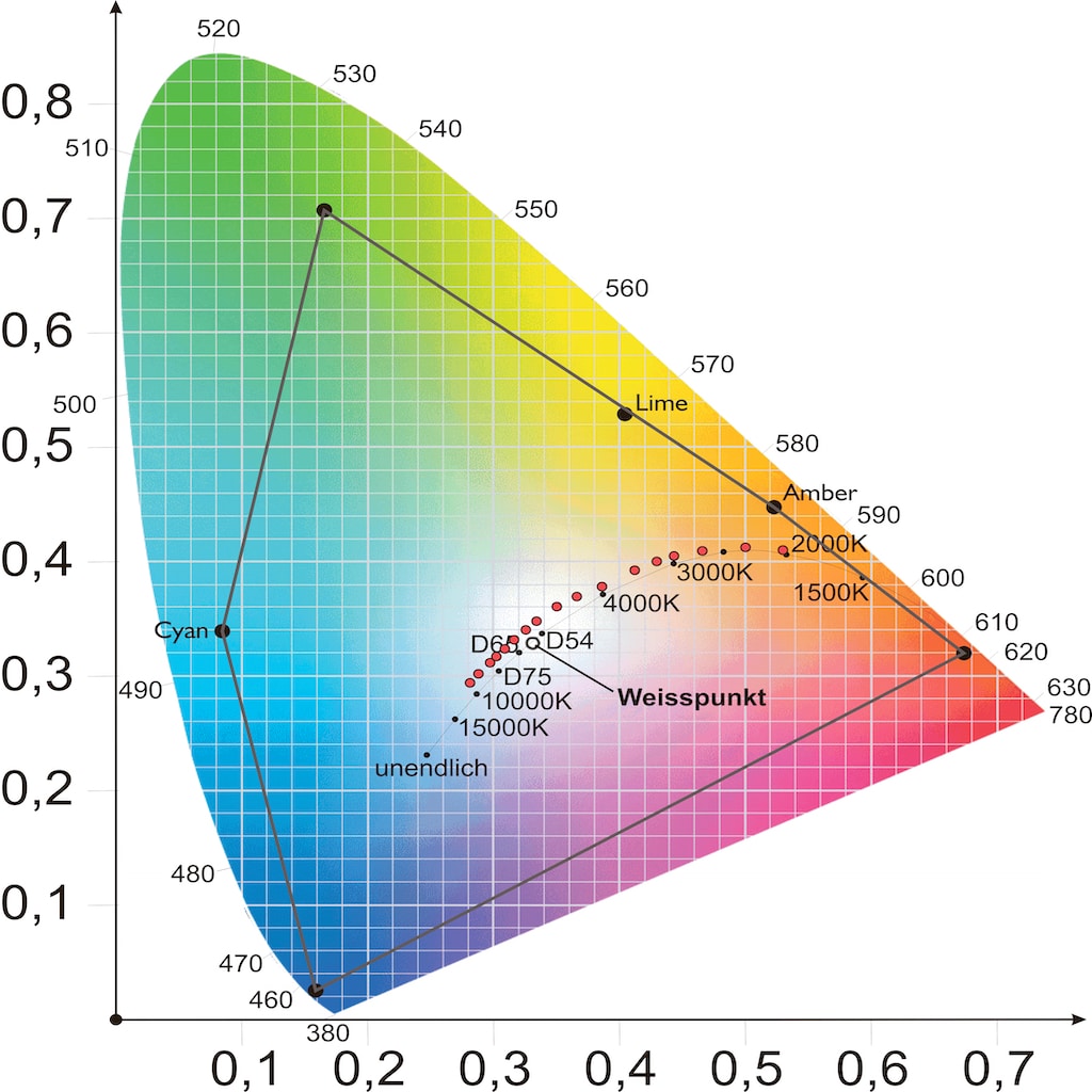 Gamut Farbraum, der mit den ausgewählten LEDs und der Kalibrierung erreicht wird – wählt man Weißlicht einer bestimmten Farbtemperatur im CCT-Mode, wird man mit einem sehr exakten Farbort an der planckschen Kurve belohnt (Bild: Herbert Bernstädt)