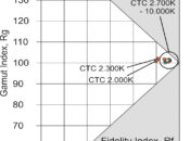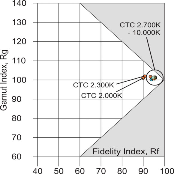Gehen wir im CCT-Mode einmal die Farbtemperaturen durch. Nicht nur, dass die zugehörigen Farborte sehr gut getroffen werden, auch die Farbqualität, sprich die CRI- und TM-30-Werte zur Charakterisierung der Farbwiedergabequalität stellt eine neue Dimension dar.
