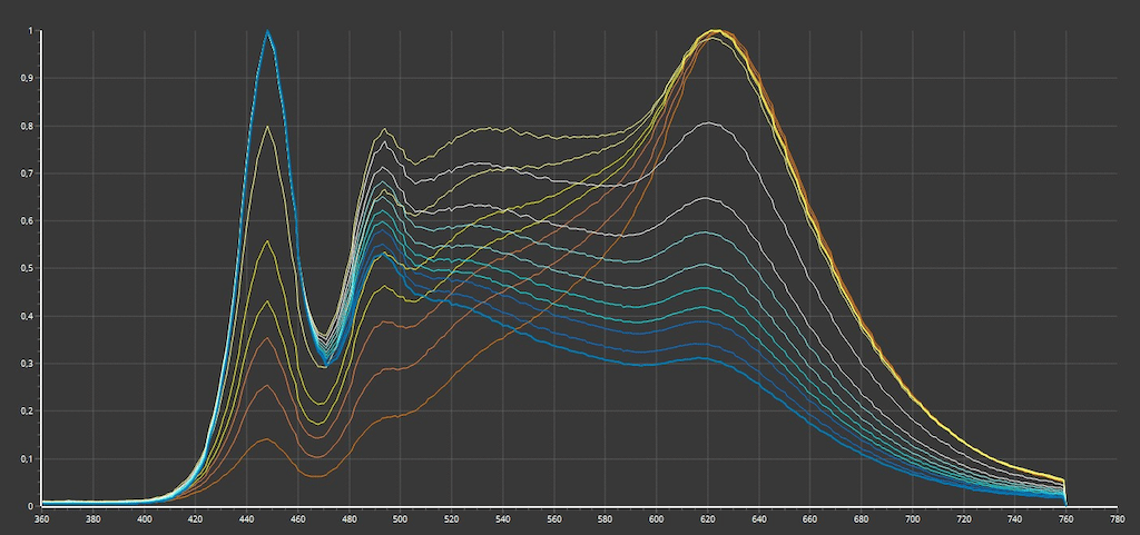 Weißlicht-Spektren im CCT-Mode, neutrale Einstellung im Verlauf von 2.000K (orange dargestellt) bis hin zu 10.000K (blau dargestellt) (Bild: Herbert Bernstädt)