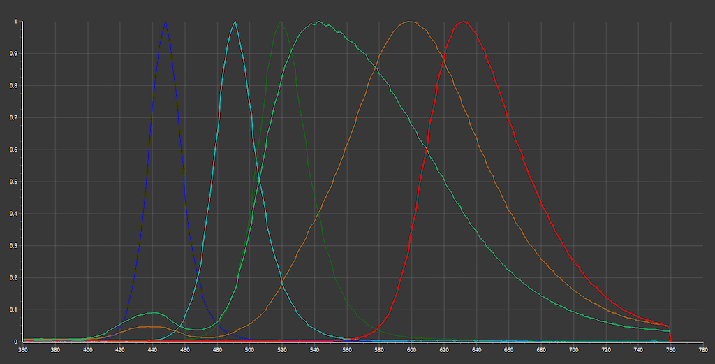 Spektren der verwendeten LEDs: Blau, Cyan, Grün, Lime, Amber, Rot – man erkennt an der leichten Blauanschwellung und der Breite des Spektrums, dass Lime und Amber über Phosphorkonvertierung gewonnen werden (Bild: Herbert Bernstädt)