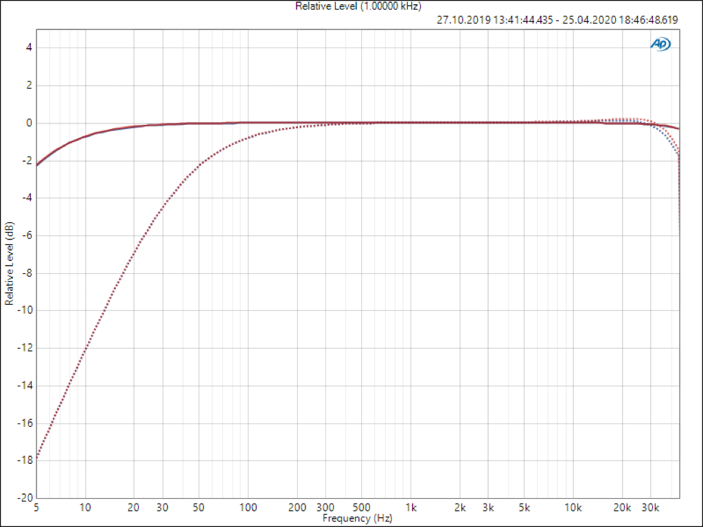 Die Frequenzgangmessungen aus Abb. 1 zeigen ein typisches Verhalten von Ausgängen mit Kondensatoren zur Entkopplung: Mit einem hohen Abschlusswiderstand ist der Frequenzgang perfekt gerade. Zu tiefen Frequenzen hin gibt es nur einen minimalen Pegelabfall von 2‑dB bei 5‑Hz. Bei kleinen Abschlusswiderständen macht sich dann der Kondensator im Signalweg bemerkbar, dessen Widerstand zu tiefen Frequenzen hin ansteigt und zu einem Hochpassverhalten führt.