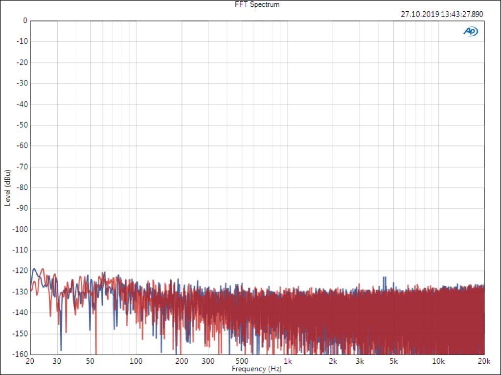 Die Signalzuspielung über das Dante-Netzwerk kann mit Abtastraten von 44,1/48/88,2 oder 96 kHz erfolgen. Auf der Ausgangsseite übernehmen die DA-Umsetzer mit den nachfolgenden analogen Ausgangsstufen die Ausspielung des Signals. Für den Anschluss werden selbstverständlich hochwertige XLR-Einbaustecker aus Metall eingesetzt. Die maximale Ausgangsspannung des ARX-Interfaces liegt bei +17,5 dBu. Der demgegenüber gemessene Störpegel an den analogen Ausgängen (Abb. 2) wurde bei uns linear bewertet zu –92,5 dBu bestimmt, woraus sich ein S/N von sehr guten 110 dB ergibt. Mit A-Bewertung des Störpegels beträgt der S/N 112,5 dB.