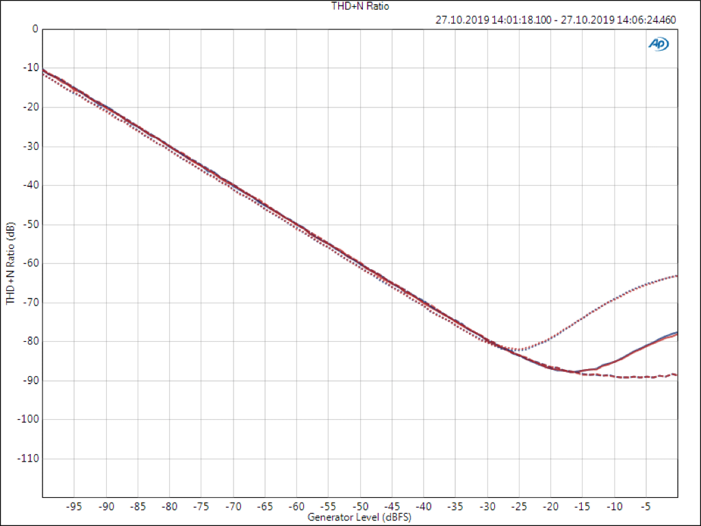 Über den Audinate-Chip DAO2 besteht die Möglichkeit, über ein digitales Gain den maximalen Ausgangspegel auf Werte von +18 dBu, +4 dBu, 0 dBu, 0 dBV oder –10 dBV einzustellen. Der Störpegel bleibt in diesem Fall konstant bei den gemessenen –92,5 dBu, lediglich der maximale Signalpegel wird reduziert, da der DAC aufgrund der runterskalierten Werte nicht mehr voll ausgesteuert werden kann. Im Extremfall für eine Einstellung von –10 dBV bedeutet das dann noch einen S/N von 84‑dB. Die Einstellung ist somit eher als eine Art „Digital Gain“ zu betrachten.