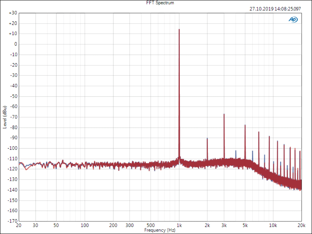 Klirrspektrum bei 1 kHz für einen Pegel von +14,5 dBu (–3 dBfs) an den analogen Ausgängen, Darstellung in absoluten Werten in dBu (Abb. 4) (Bild: Anselm Goertz)