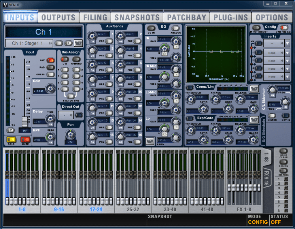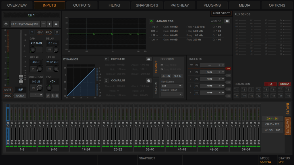 Das Anlegen der Show braucht wenig Zeit, Patching und Beschriftung sind schnell. Vermisst wurde eine ausgefeiltere Copy/paste-Funktion. Hier sind nach wie vor der Rechtsklick auf einzelne Parameter Parametersektionen (EQ, Comp, Gate, komplett) oder den kompletten Kanalzug die möglichen Optionen. Dadurch sind sehr viele Tasten- und Button-Drücke nötig, um grundlegende Einstellungen (wie LoCut / HiCut aktiv, EQ aktiv, Compressor/Gate aktiv) über alle Kanäle vorzunehmen.