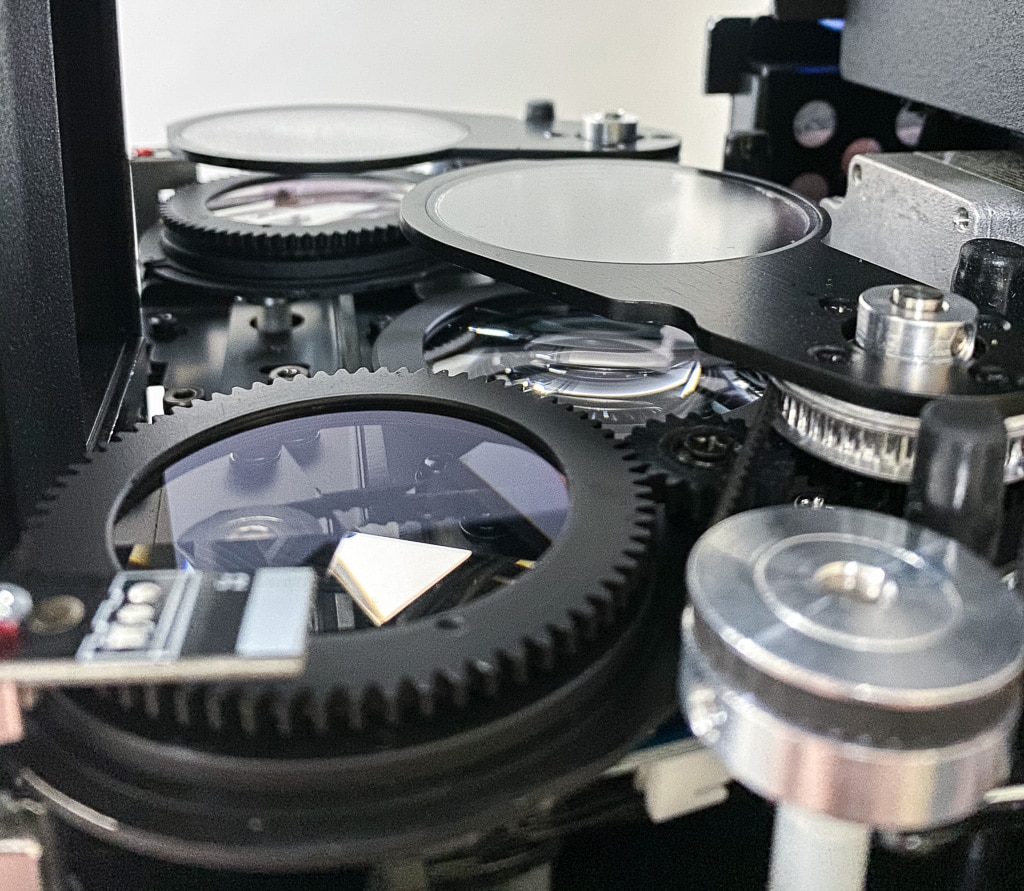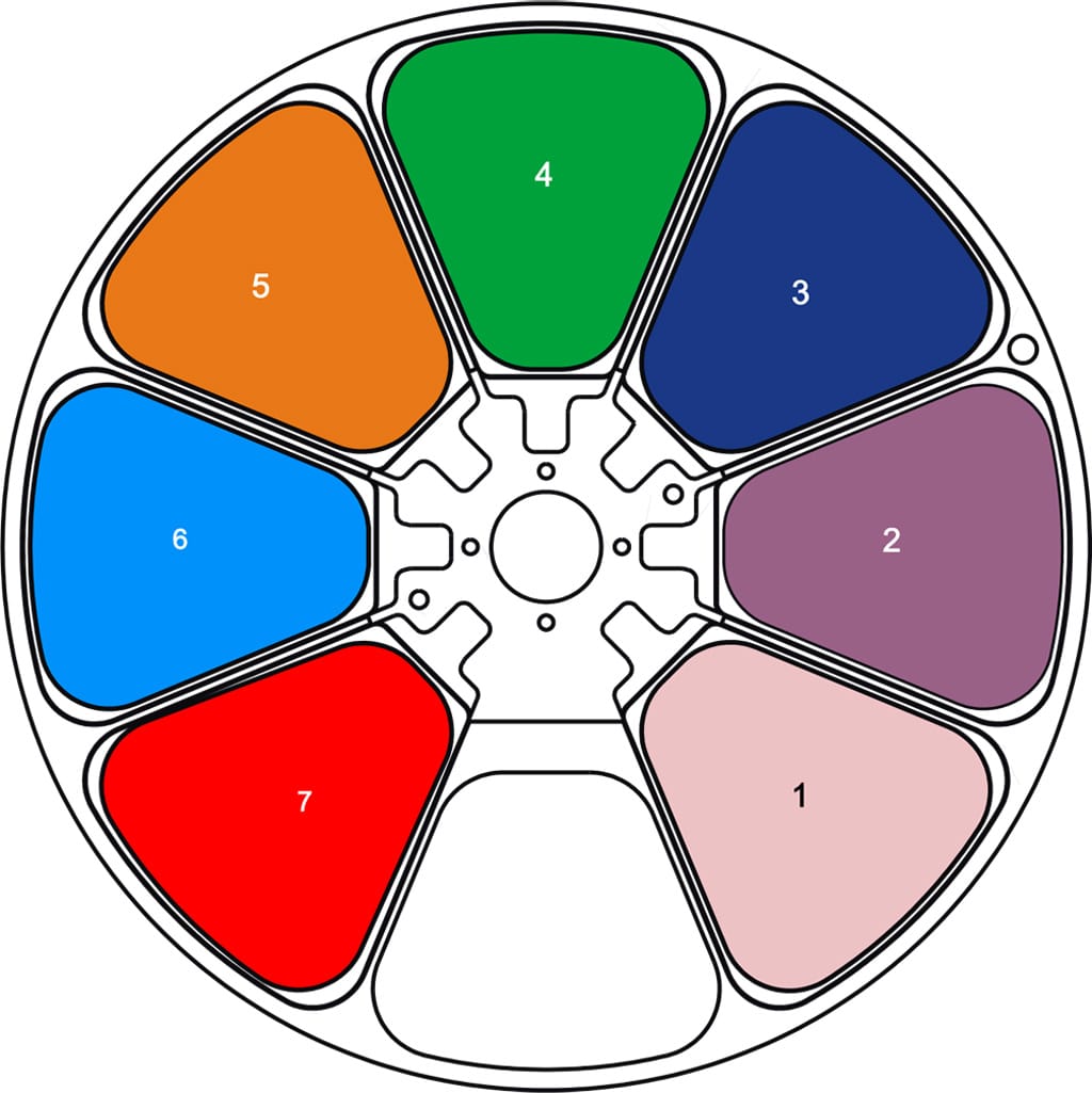 Farbradbestückung 1: Minus Green 1/2, 2: Magenta, 3: Congo blue, 4: Green, 5: Orange, 6: Blue, 7: Red (Bild: Stefan Junker)