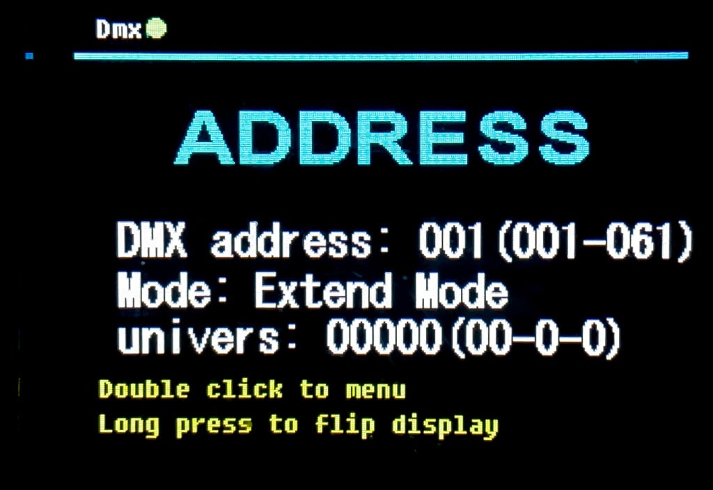 Das Setup mittels physischen Tasten und Farbdisplay erfolgt intuitiv. Äußerst praktikabel und erfreulich ist dabei die unmittelbare On-Screen-Hilfe zum Invertieren der Anzeige sowie der Navigation im Menü mittels „double click“ (Enter) und „longpress“ (Esc). Die wichtigsten Daten wie DMX-Patch inklusive der nächsten freien Adresse, DMX-Modus sowie ArtNet-Universe sind dabei im Homescreen direkt ablesbar. Eine Akkupufferung des Displays zur “stromlosen” Konfiguration des Scheinwerfers wird es leider nicht geben.